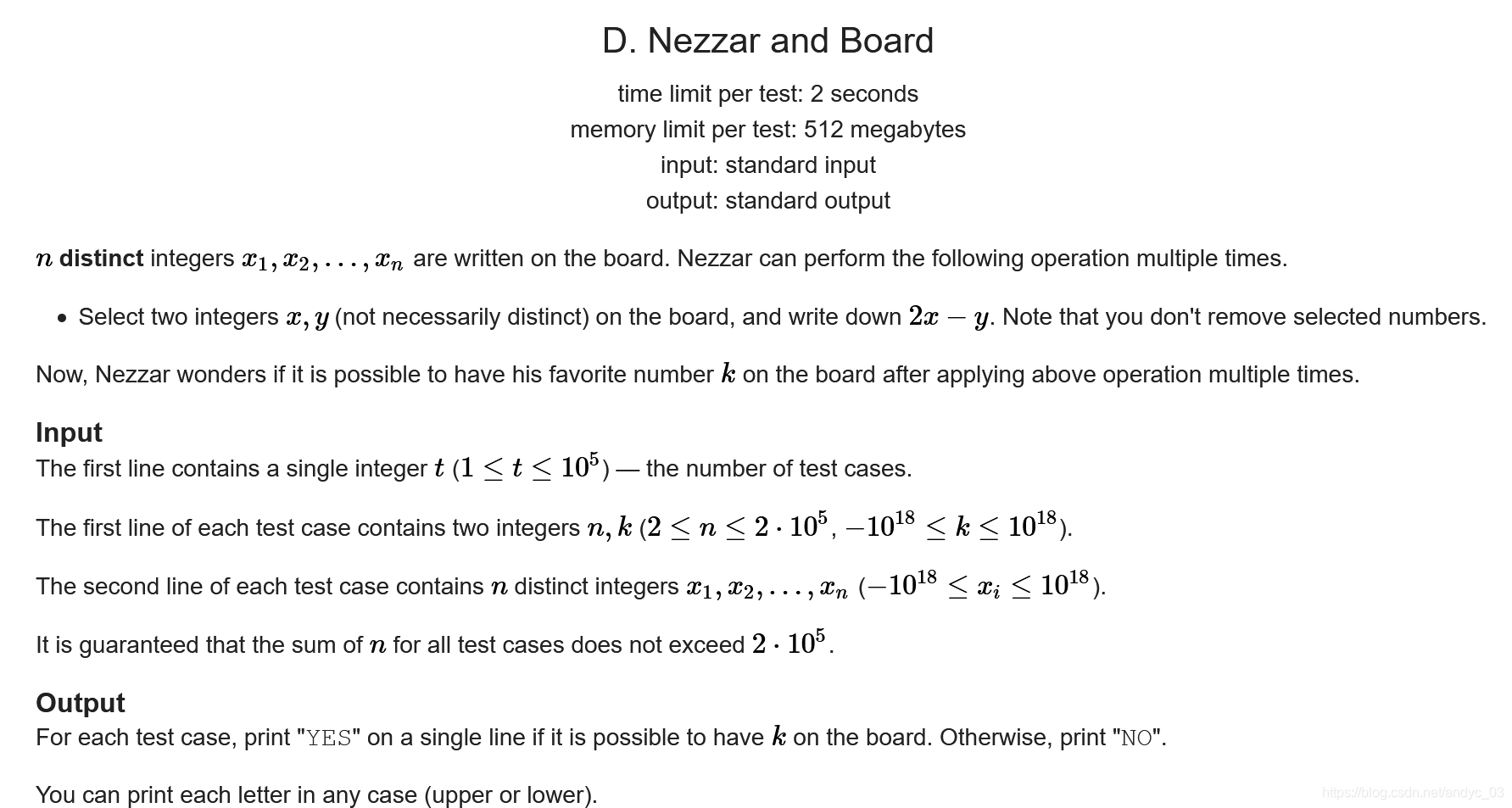题意:给出一个序列,你可以任意挑选两个数x,y将2*x-y加入序列中,询问在是否可以在序列中得到k