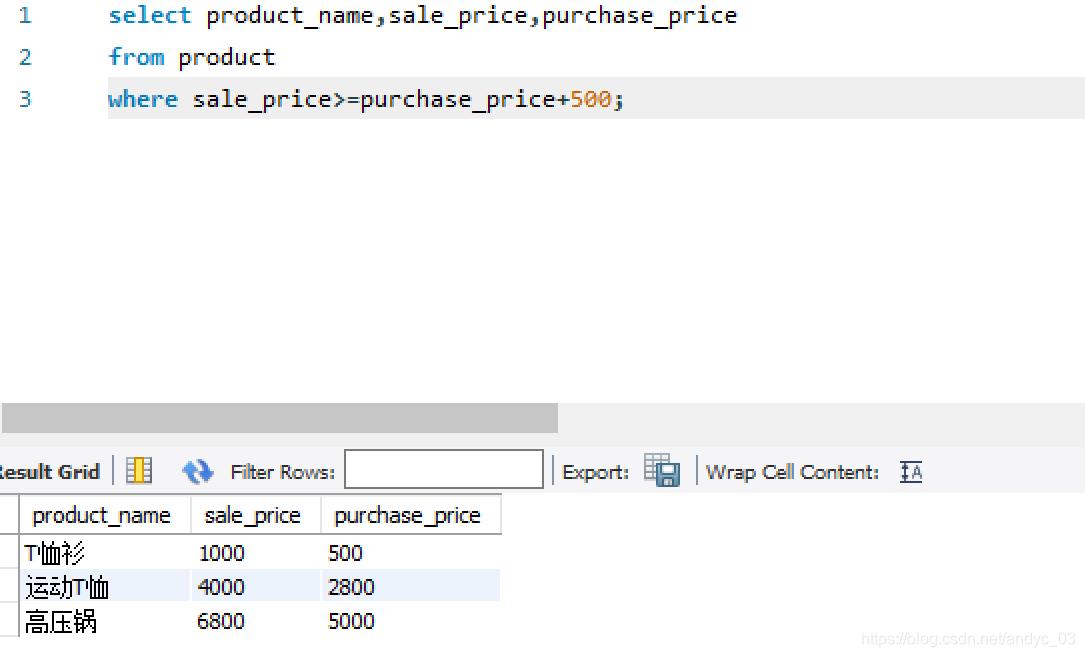 代码清单2-22(2-2节)中的SELECT语句能够从product表中取出“销售单价(saleprice)比进货单价(purchase price)高出500日元以上”的商品。请写出两条可以得到相同结果的SELECT语句。执行结果如下所示。