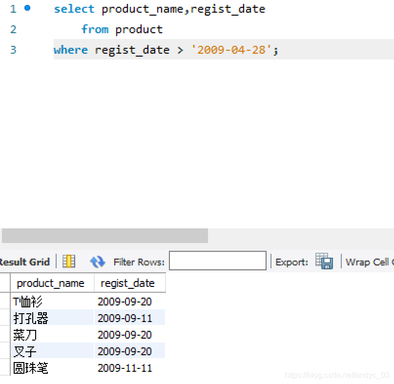 编写一条SQL语句,从product(商品)表中选取出“登记日期(regist在2009年4月28日之后”的商品,查询结果要包含product_name和regist_date两列。