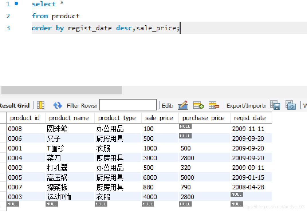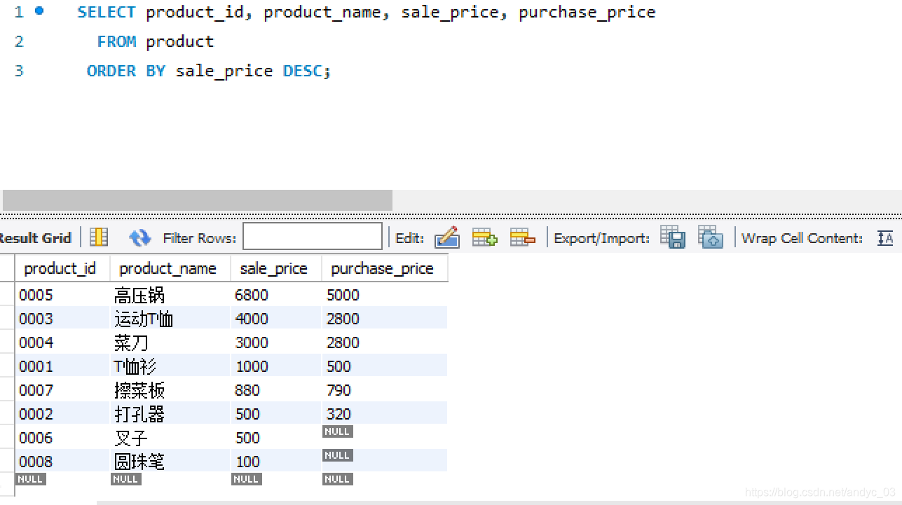 此前我们曾经使用SELECT语句选取出了product(商品)表中的全部记录。当时我们使用了ORDERBY子句来指定排列顺序,但现在已经无法记起当时如何指定的了。请根据下列执行结果,思考ORDERBY子句的内容。