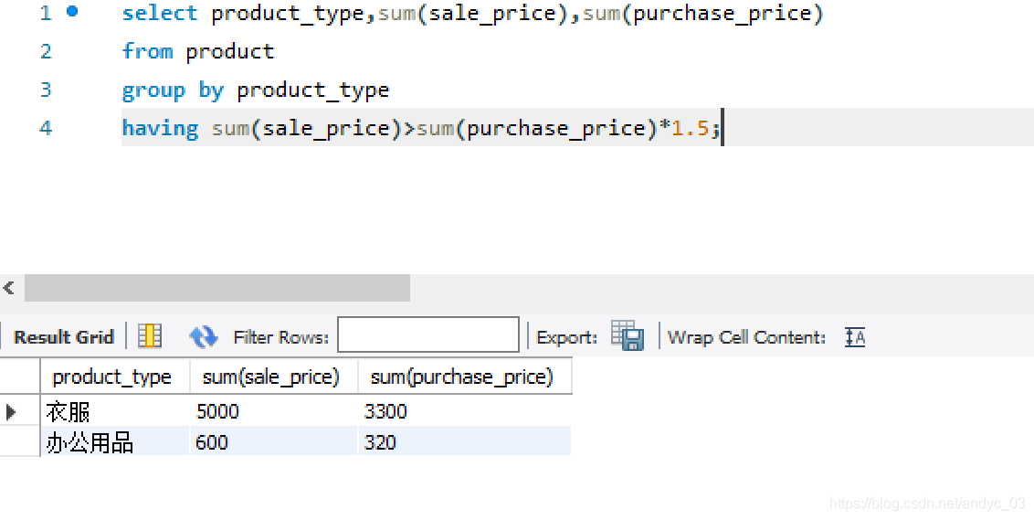 请编写一条SELECT语句,求出销售单价(sale_price列)合计值大于进货单价(purchase_price列)合计值1.5倍的商品种类。执行结果如下所示。