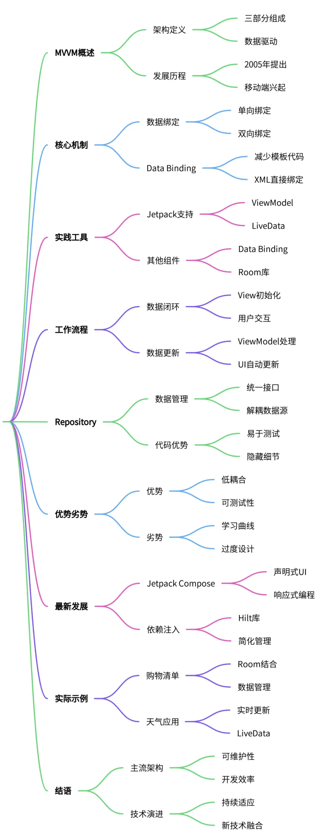 在Android开发中,MVVM(Model-View-ViewModel)是一种基于数据驱动的架构设计模式,旨在分离应用的UI逻辑与业务逻辑。结合架构组件(如LiveData、ViewModel、DataBinding),可以有效地减少代码耦合、提升代码可维护性。MVVM模式强调数据驱动UI更新,使得应用逻辑和UI分离更加清晰。