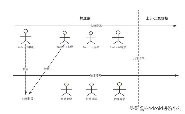 从图中可以看出,大部分人在35岁前是在加速期,35岁后是上升或者衰落期。以Android开发转前端来说,假设一个Android高级A同学转行前端会变为前端初级,这时从事前端的人都在加速提高,A同学要想赶超前面的拥有同样加速度的人是不可能办到的。