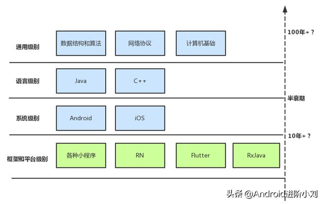 上面的半衰期图不完全准确,但是却值得参考,如果你是其他的技术领域也可以参考这个半衰期图。这个图不是告诉我们不要去学RN和小程序,而是结合自身工作尽量学习半衰期长的知识。
