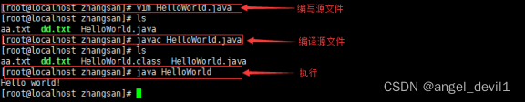 第五步:在目录/home/zhangsan下编写HelloWorld.java编译并运行