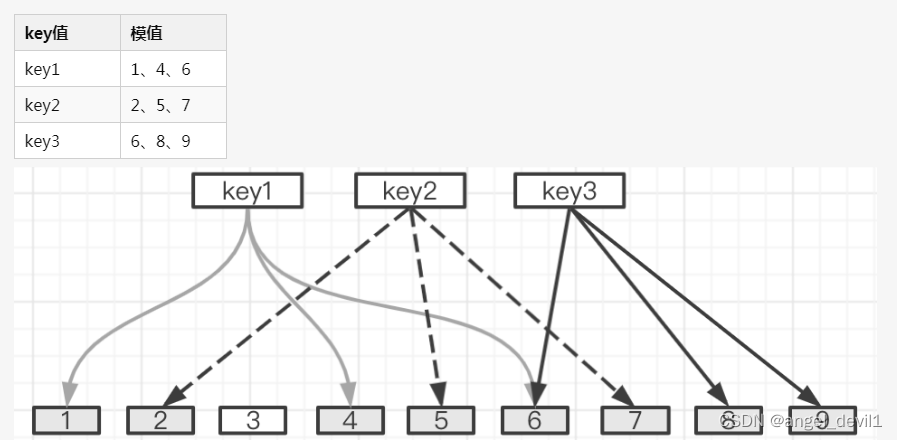 对于 key1,我们借助三个 Hash 函数分别对其哈希运算