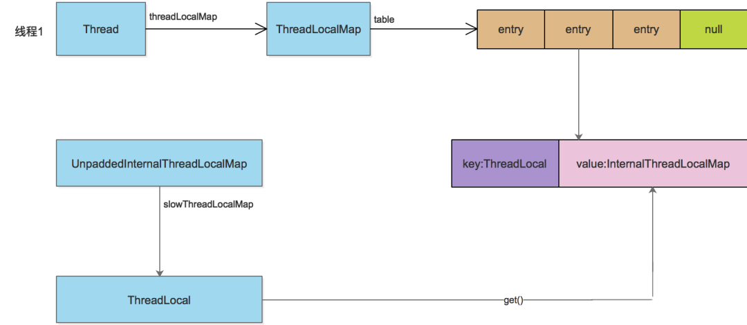 =======================InternalThreadLocalMap=======================public static InternalThreadLocalMap get() {Thread thread = Thread.currentThread();if (thread instanceof FastThreadLocalThread) {return fastGet((FastThreadLocalThread) thread);} else {return slowGet();}}private static InternalThreadLocalMap fastGet(FastThreadLocalThread thread) {InternalThreadLocalMap threadLocalMap = thread.threadLocalMap();if (threadLocalMap == null) {thread.setThreadLocalMap(threadLocalMap = new InternalThreadLocalMap());}return threadLocalMap;}