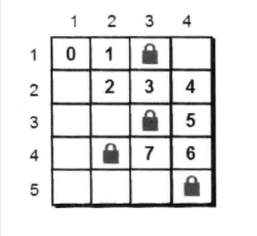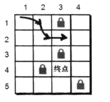 #include<stdio.h> int m,n,p,q; int next[4][2],book[51][51],book1[51],book2[51],a[51][51]; int min=99999; void dfs(int x,int y,int step) { int tx,ty,k,j; if(x == p && y == q) { if(step<min) min = step; for(j=0;j<step;j++) printf("(%d %d) ",book1[j],book2[j]); printf("\n"); return; } int next[4][2]= { {0,1}, //右走 {1,0}, //下走 {0,-1}, //左走 {-1,0}, //上走 }; for(k=0;k<=3;k++) { tx = x + next[k][0]; ty = y + next[k][1]; if(tx>n||ty>m||tx<1||ty<1) continue; if(a[tx][ty]==0 && book[tx][ty]==0) { book1[step] = tx; book2[step] = ty; book[tx][ty] = 1; dfs(tx,ty,step+1); book[tx][ty] = 0; } } return; } int main() { int i,j,startx,starty; scanf("%d %d",&n,&m); for(i=1;i<=n;i++) { for(j=1;j<=m;j++) { scanf("%d",&a[i][j]); } } scanf("%d %d %d %d",&startx,&starty,&p,&q); book[startx][starty] = 1; dfs(startx,starty,0); printf("%d",min); return 0; }