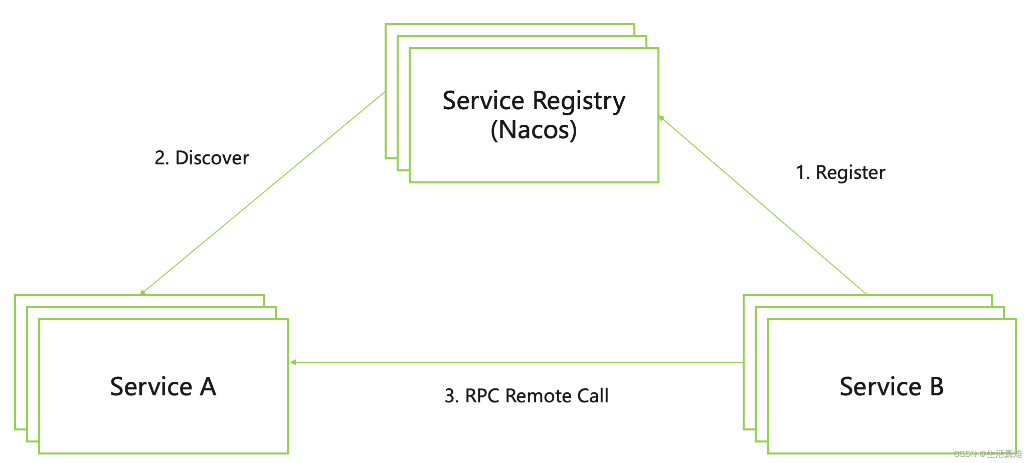 微服务与传统单体式应用架构最大区别就是强调软件模块的拆分。在单体架构下,一个应用系统的多个功能模块由于组织在一起在同一个应用进程内部署与运行,因此,模块之间直接通过方法调用即可完成对一次请求的响应。但在微服务系统中,需要对一个应用系统根据其功能特点,按照一定粒度进行拆分后单独部署,以便实现模块内的高内聚,模块间的低耦合,实现整个微服务系统的高可扩展性。 原来一次在一个应用内即可完成的请求处理,会出现跨进程跨主机的服务调用,如何让这个服务之间能互相发现像单体式应用一样提供统一对外的服务调用能力是微服务框架层面需要重点解决的核心问题之一。 在 Spring Cloud 生态中,采用了如下服务注册与发现模型,来实现微服务之间的互相发现与调用。