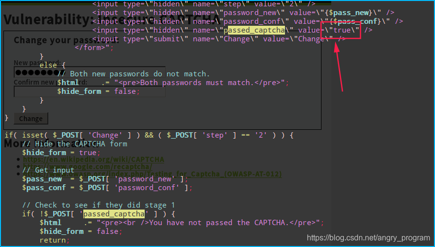 在Medium级别中, 进一步加强了对step=2时防御, 通过passed_captcha变量来防止攻击者跳过验证, 说白了, 代码逻辑还是有漏洞。
