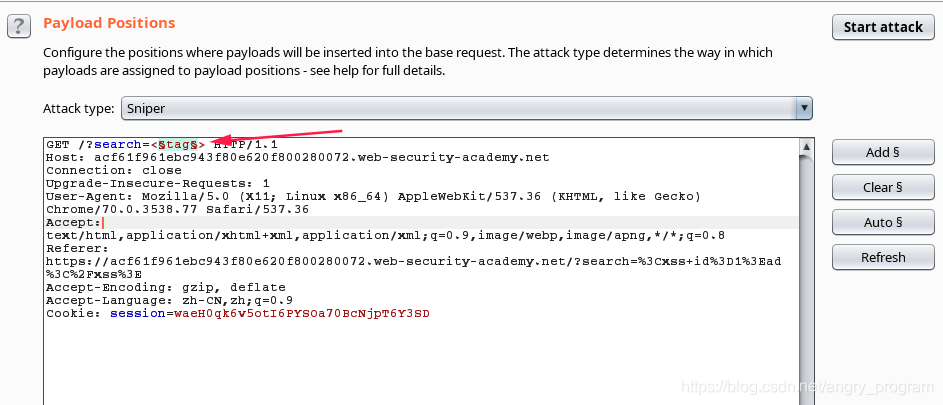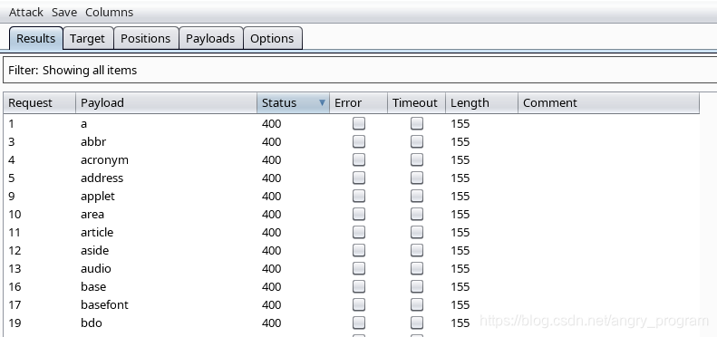 测试伊始, 当然是寻找waf允许的标签以及事件类型, 这里本人采用burpsuite的intruder来Fuzz, 看看是否存在某些tag或者event是可行的。