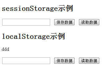 <!DOCTYPE HTML> <html> <head> <meta charset="utf-8"> <title>HTML5 Web Storage示例</title> <script type="text/javascript"> // sessionStorage示例JS function savesessionStorage(id) { var target = document.getElementById(id); var str = target.value; sessionStorage.setItem("message", str); } function loadsessionStorage(id) { var target = document.getElementById(id); var msg = sessionStorage.getItem("message"); target.innerHTML = msg; } // localStorage示例JS function savelocalStorage(id) { var target = document.getElementById(id); var str = target.value; localStorage.setItem("message", str); } function loadlocalStorage(id) { var target = document.getElementById(id); var msg = localStorage.getItem("message"); target.innerHTML = msg; } </script> </head> <body> <div> <h2>sessionStorage示例</h2> <p id="sessionMsg"></p> <input type="text" id="sessionInput"> <input type="button" value="保存数据" onClick="savesessionStorage('sessionInput');"> <input type="button" value="读取数据" onClick="loadsessionStorage('sessionMsg');"> <br/> <h2>localStorage示例</h2> <p id="localMsg"></p> <input type="text" id="localInput"> <input type="button" value="保存数据" onClick="savelocalStorage('localInput');"> <input type="button" value="读取数据" onClick="loadlocalStorage('localMsg');"> </div> </body> </html>