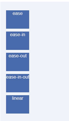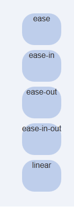 <!DOCTYPE HTML> <html lang="en-US"> <head> <meta charset="UTF-8"> <title></title> <style type="text/css"> .trans_box { width: 800px; padding: 20px; background-color: #f0f3f9; } .trans_list { width: 10%; height: 64px; margin: 10px 0; background-color: #486AAA; color: #fff; text-align: center; } .ease { -webkit-transition: all 4s ease; -moz-transition: all 4s ease; -o-transition: all 4s ease; transition: all 4s ease; } .ease_in { -webkit-transition: all 4s ease-in; -moz-transition: all 4s ease-in; -o-transition: all 4s ease-in; transition: all 4s ease-in; } .ease_out { -webkit-transition: all 4s ease-out; -moz-transition: all 4s ease-out; -o-transition: all 4s ease-out; transition: all 4s ease-out; } .ease_in_out { -webkit-transition: all 4s ease-in-out; -moz-transition: all 4s ease-in-out; -o-transition: all 4s ease-in-out; transition: all 4s ease-in-out; } .linear { -webkit-transition: all 4s linear; -moz-transition: all 4s linear; -o-transition: all 4s linear; transition: all 4s linear; } .trans_box:hover .trans_list, .trans_box_hover .trans_list { margin-left: 89%; background-color: #beceeb; color: #333; -webkit-border-radius: 25px; -moz-border-radius: 25px; -o-border-radius: 25px; border-radius: 25px; -webkit-transform: rotate(360deg); -moz-transform: rotate(360deg); -o-transform: rotate(360deg); transform: rotate(360deg); } </style> </head> <body> <pre> transition-property :* //指定过渡的性质,比如transition-property:backgrond 就是指backgound参与这个过渡 transition-duration:*//指定这个过渡的持续时间 transition-delay:* //延迟过渡时间 transition-timing-function:*//指定过渡类型,有ease | linear | ease-in | ease-out | ease-in-out | cubic-bezier </pre> <div id="transBox" class="trans_box"> <div class="trans_list ease"> ease </div> <div class="trans_list ease_in"> ease-in </div> <div class="trans_list ease_out"> ease-out </div> <div class="trans_list ease_in_out"> ease-in-out </div> <div class="trans_list linear"> linear </div> </div> </body> </html>