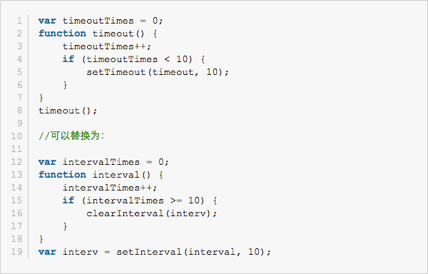 如果针对的是不断运行的代码,不应该使用setTimeout,而应该是用setInterval,因为setTimeout每一次都会初始化一个定时器,而setInterval只会在开始的时候初始化一个定时器。