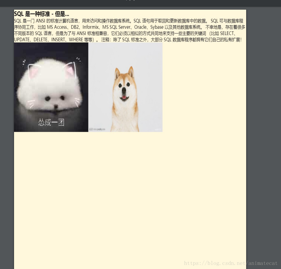 <div class="ccontent">SQL 是一门 ANSI 的标准计算机语言,用来访问和操作数据库系统。SQL 语句用于取回和更新数据库中的数据。 SQL 可与数据库程序协同工作,比如 MS Access、DB2、Informix、MS SQL Server、Oracle、Sybase 以及其他数据库系统。 不幸地是,存在着很多不同版本的 SQL 语言,但是为了与 ANSI 标准相兼容,它们必须以相似的方式共同地来支持一些主要的关键词 (比如 SELECT、UPDATE、DELETE、INSERT、WHERE 等等)。 注释:除了 SQL 标准之外,大部分 SQL 数据库程序都拥有它们自己的私有扩展!</div>