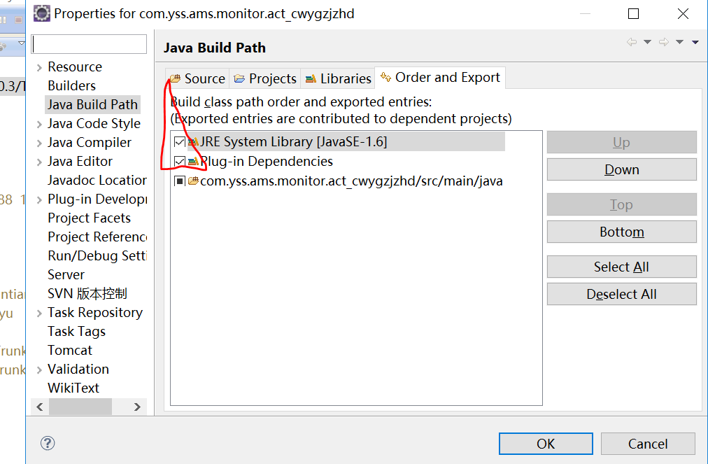 解决办法二:右键项目——>build path——>configure build path——>order and export。把里面的选项勾上再打包,问题解决。
