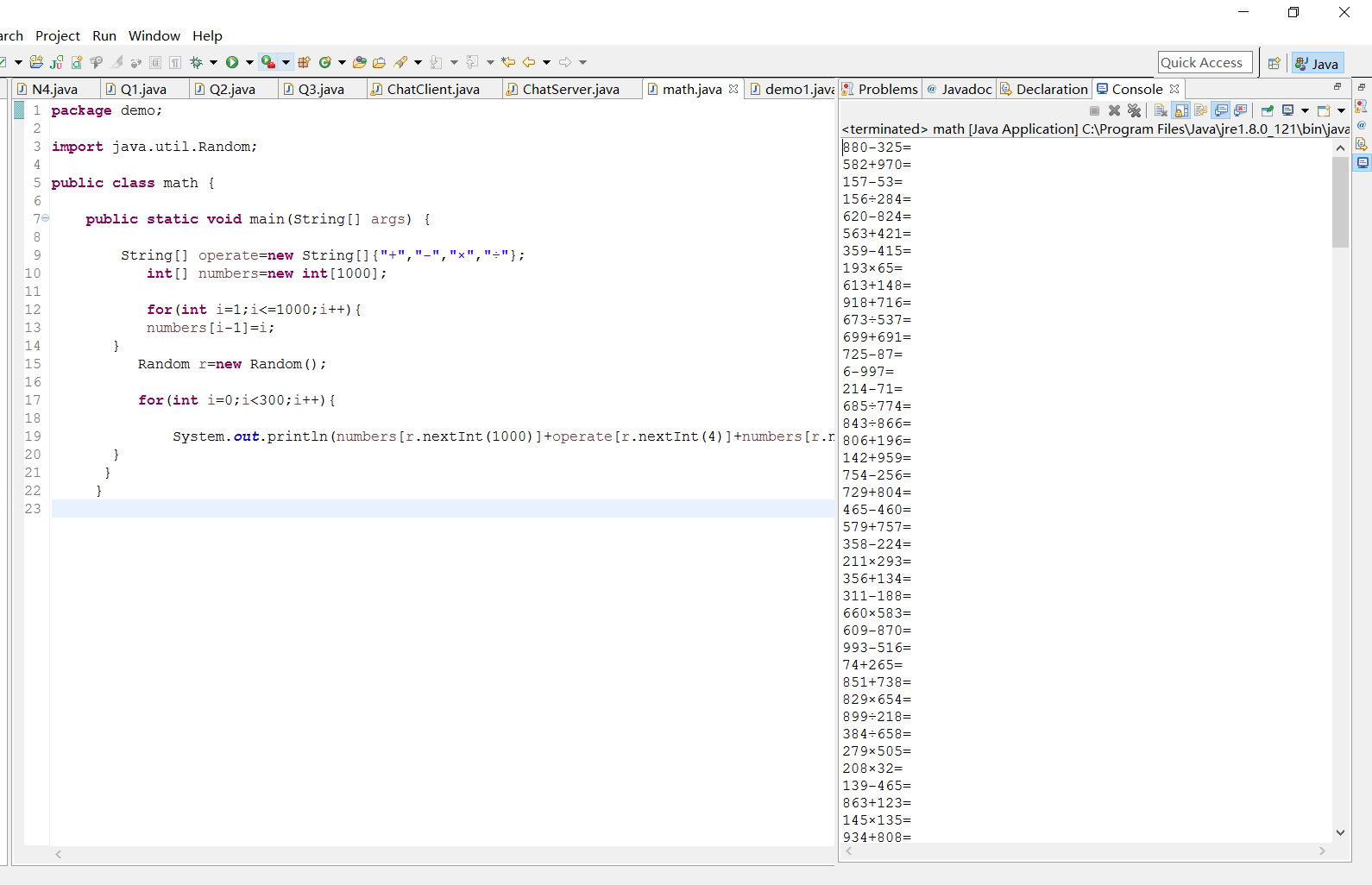 package demo; import java.util.Random; public class math { public static void main(String[] args) { String[] operate=new String[]{"+","-","×","÷"}; int[] numbers=new int[1000]; for(int i=1;i<=1000;i++){ numbers[i-1]=i; } Random r=new Random(); for(int i=0;i<300;i++){ System.out.println(numbers[r.nextInt(1000)]+operate[r.nextInt(4)]+numbers[r.nextInt(1000)]+"="); } } }