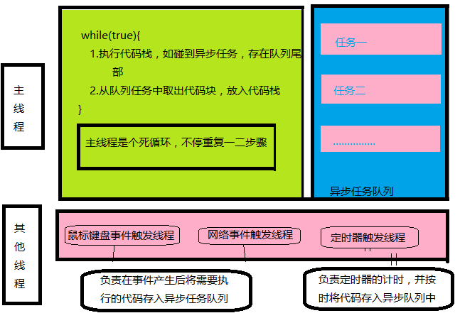 因为这些任务的发生都不是发生在当下,而是过一段事件以后再执行。因此时间不可控。简单的就是说,你不能让因为5秒后要执行一个函数,就让主线程闲置5秒什么都不干吧!所以你只能继续执行后续的同步代码。而当你单击鼠标或滚动窗口时,主线程可能正在执行其他的任务,忙着呢!没有功夫处理,因此,事件触发线程就负责来接收这个事件,并把要执行的任务暂时保存在队列当中。等主线程把手里的同步代码执行完成后,就立刻会向任务队列提取最新的任务。