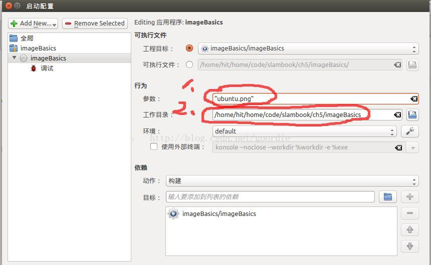 3.左栏选择要传递参数的工程名,在参数一栏中,输入参数“ubuntu.png”,再输入“工作目录”。点击OK,运行就可以了。