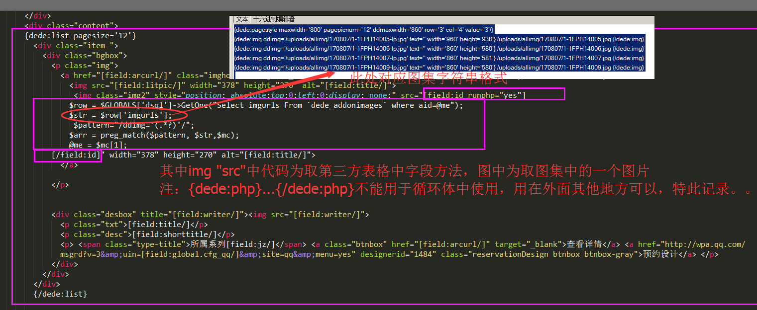 {dede:list pagesize='12'} <div class="item "> <div class="bgbox"> <p class="img"> <a href="[field:arcurl/]" class="imghover" target="_blank" title="[field:title/]" style="display:block;position: relative;"> <img src="[field:litpic/]" width="378" height="270" alt="[field:title/]"> <img class="img2" style="position: absolute;top:0;left:0;display: none;" src="[field:id runphp="yes"] $row = $GLOBALS['dsql']->GetOne("Select imgurls From `dede_addonimages` where aid=@me"); $str = $row['imgurls']; $pattern="/ddimg='(.*?)'/"; $arr = preg_match($pattern, $str,$mc); @me = $mc[1]; [/field:id]" width="378" height="270" alt="[field:title/]"> </a> </p> <div class="desbox" title="[field:writer/]"><img src="[field:writer/]"> <p class="txt">[field:title/]</p> <p class="desc">[field:shorttitle/]</p> <p> <span class="type-title">所属系列[field:jz/]</span> <a class="btnbox" href="[field:arcurl/]" target="_blank">查看详情</a> <a href="http://wpa.qq.com/msgrd?v=3&uin=[field:global.cfg_qq/]&site=qq&menu=yes" designerid="1484" class="reservationDesign btnbox btnbox-gray">预约设计</a> </p> </div> </div> </div> {/dede:list}