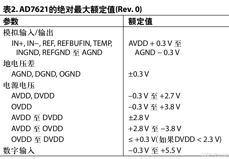 AD7794 Σ-Δ型24位ADC是另一个很好的例子。表3摘自AD7794 (Rev. D)数据手册的“绝对最大额定值”部分。