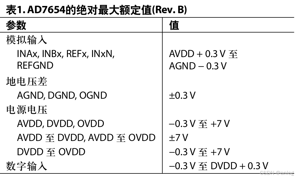 表1. AD7654的绝对最大额定值(Rev. B)