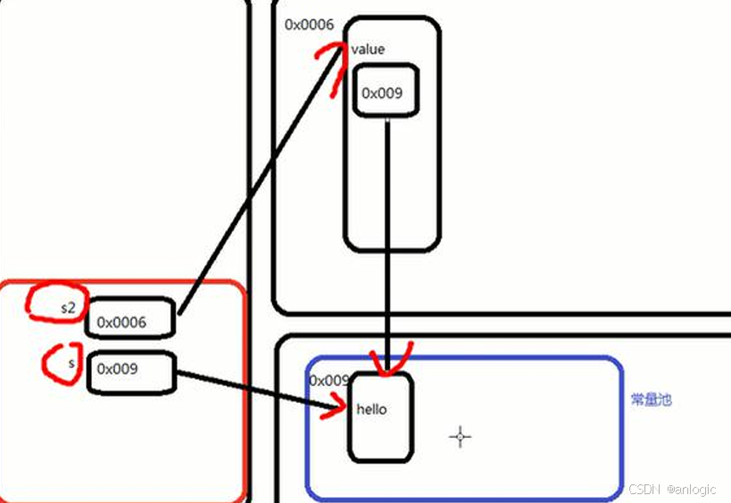 - 方式二:先在堆中创建空间,里面维护了value属性,指向常量池的logic空间,如果常量池没有"logic",重新创建,如果有,直接通过value指向 最终指向的是堆中的空间地址