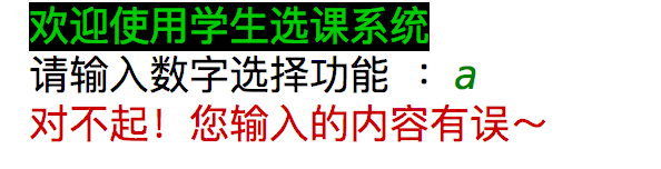 print('\033[0;32;40m欢迎使用学生选课系统\033[0m') try: num = int(input('请输入数字选择功能 :')) except Exception as e: print('\033[31m对不起!您输入的内容有误~\033[0m')