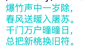 print('\033[0;36m爆竹声中一岁除,') print('春风送暖入屠苏。') print('千门万户曈曈日,') print('总把新桃换旧符。\033[0m')