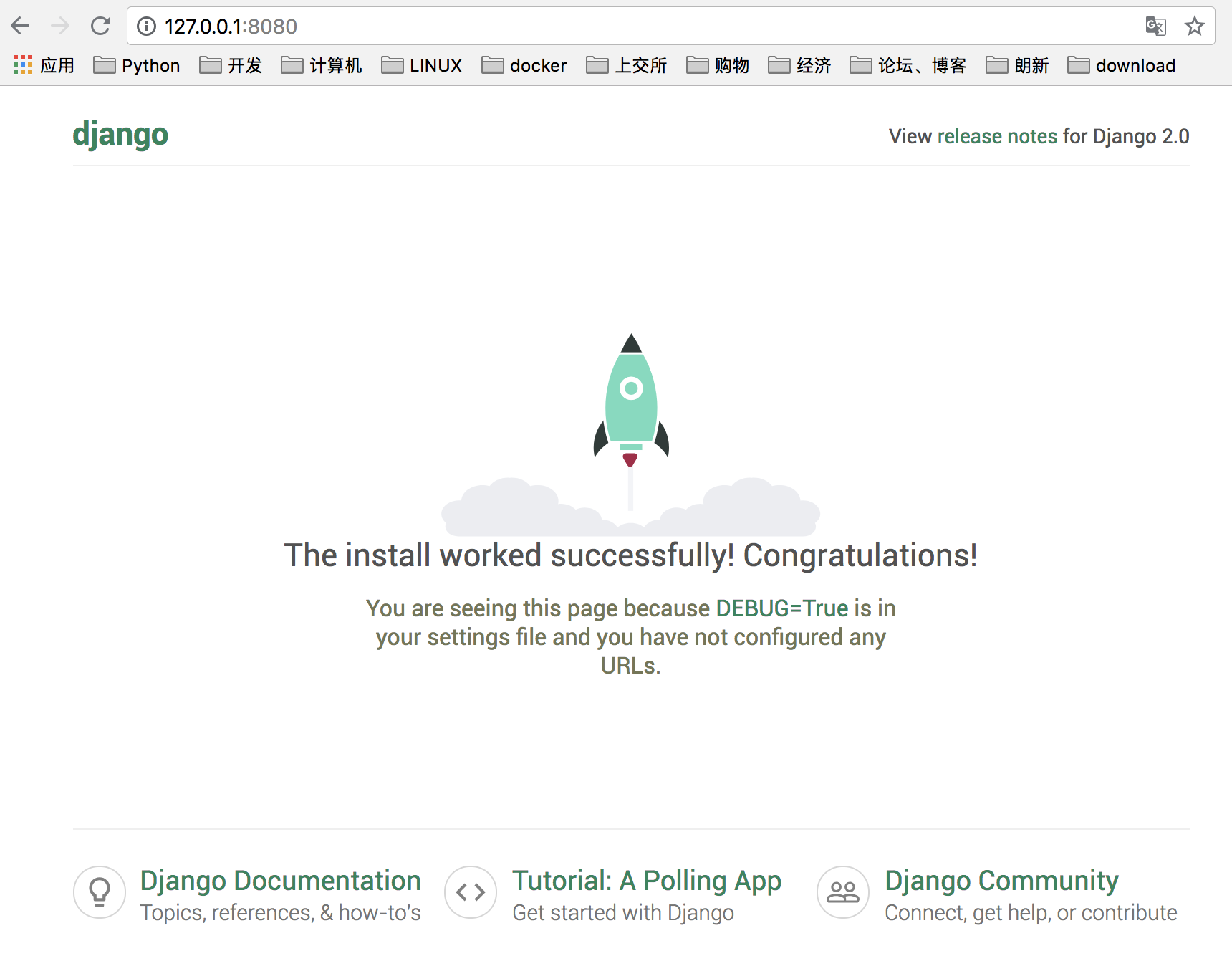 这样我们的django就启动起来了!当我们访问:http://127.0.0.1:8080/时就可以看到: