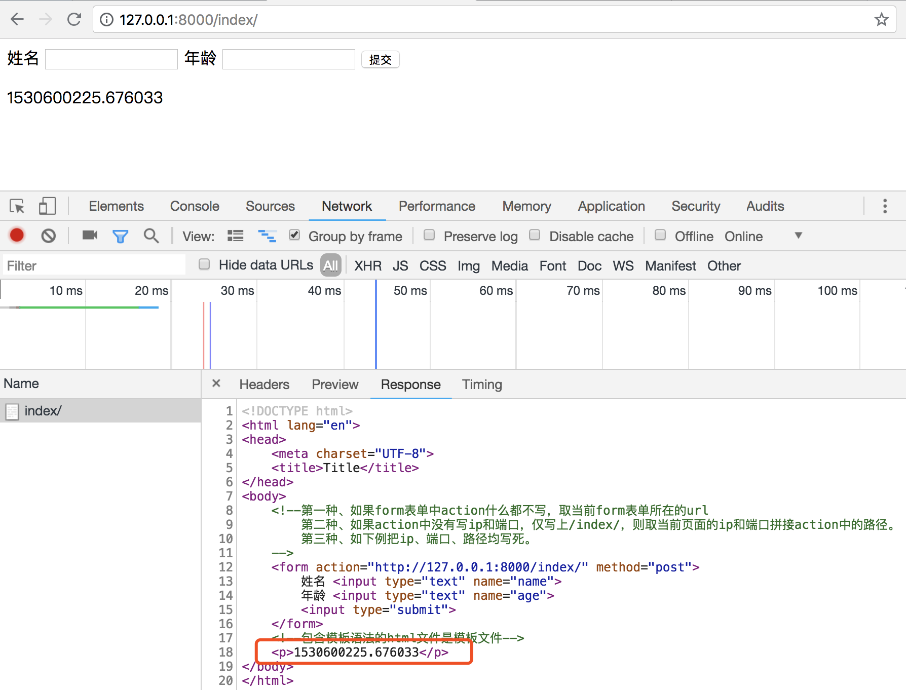 浏览器访问http://127.0.0.1:8000/index/ 填写表单后提交 输出<QueryDict: {'name': ['alex'], 'age': ['13']}>