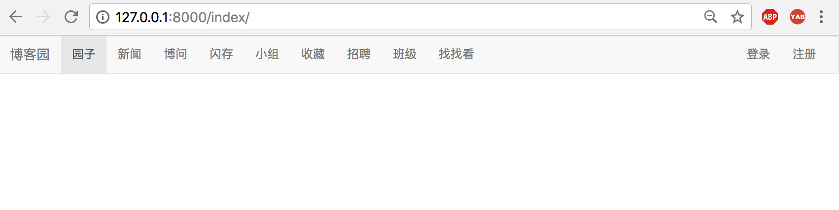 在首页点击注销操作,页面返回到登录页面,手动访问博客首页,导航栏右侧显示登录/注册按钮。