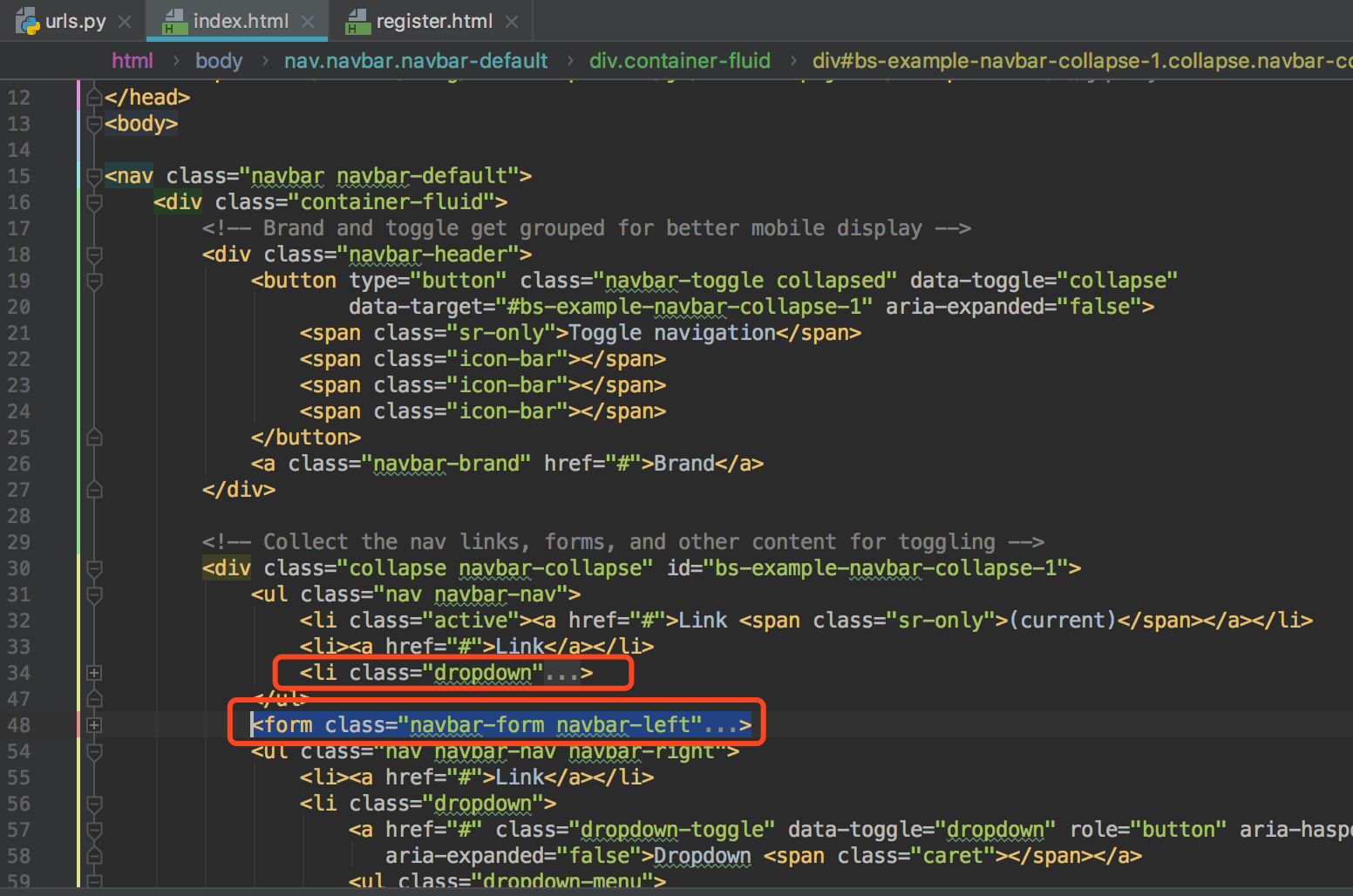 由于我们的页面导航栏用不上,删除模板中的form标签和<li class="dropdown">标签的内容。