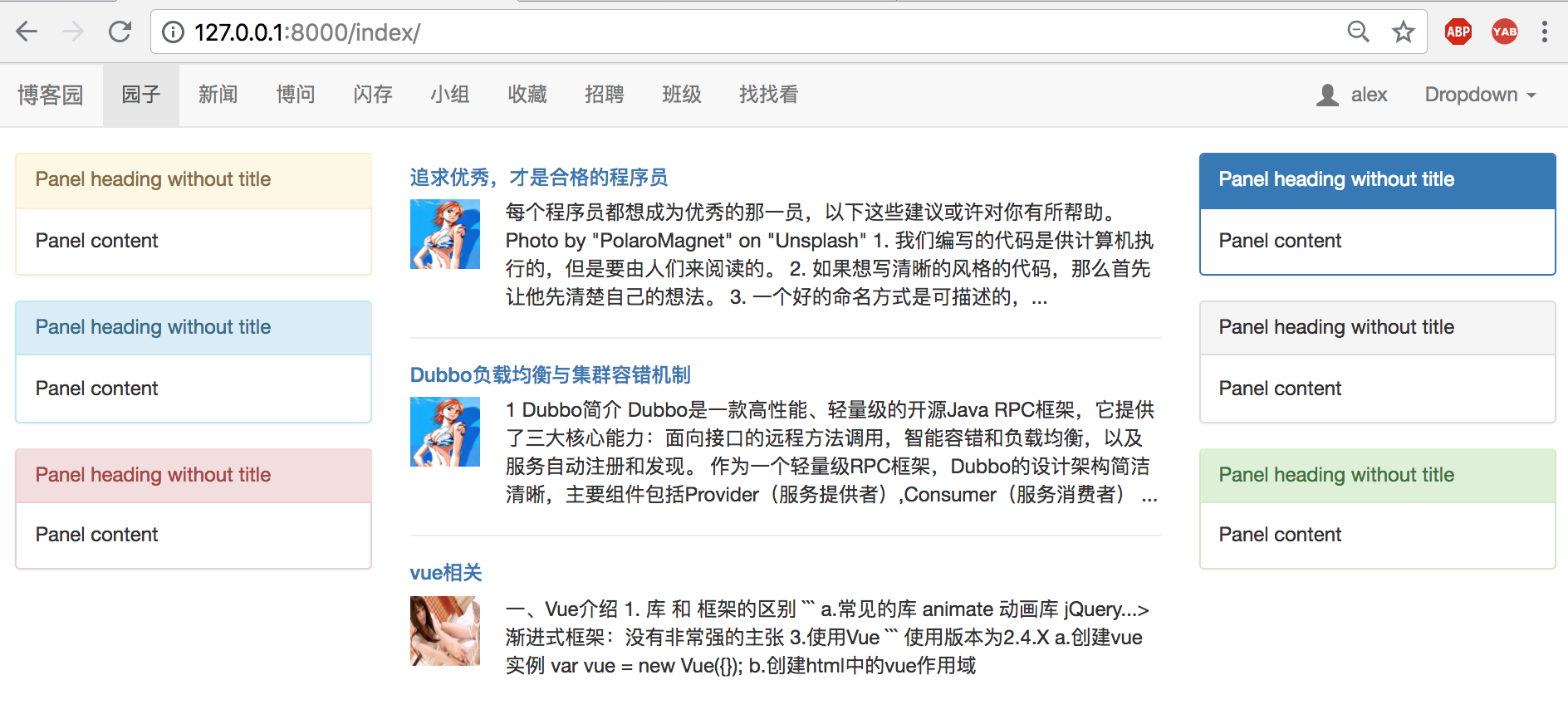 (3)利用bootstrap提供的media-left和media-right调整文章样式,添加<hr>标签分隔文章块。