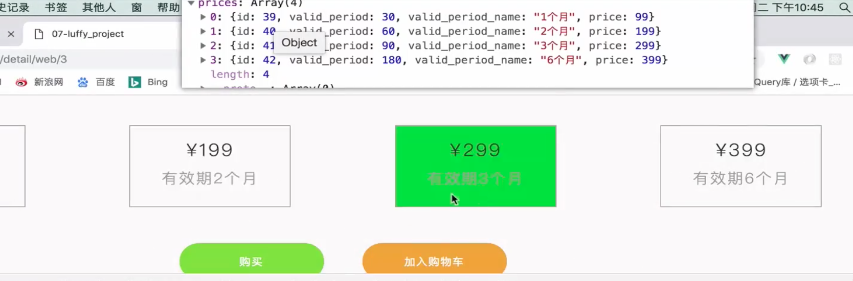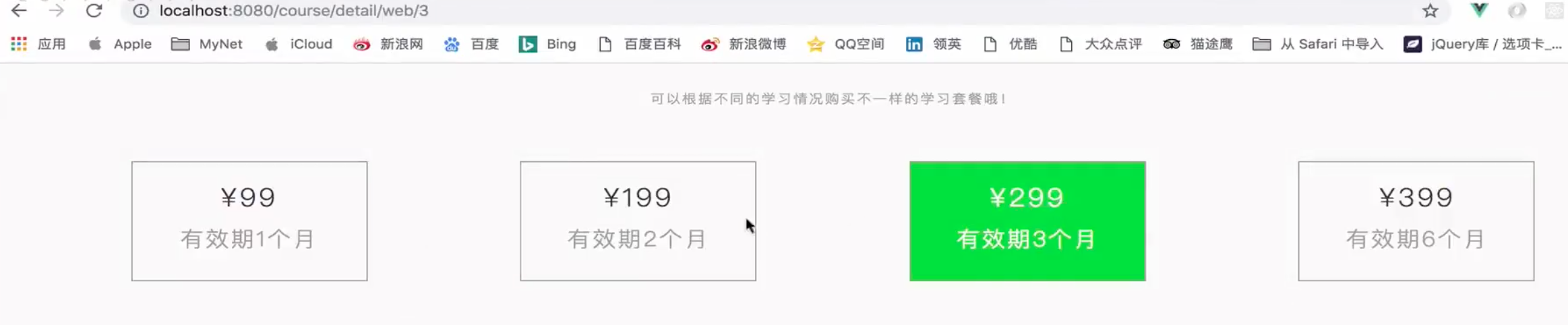 <div class="course-price"> <div class="container"> <span>可以根据不同的学习情况购买不一样的学习套餐哦!</span> <ul class="course-price-item" > <li v-for="(item, index) in coursedetail.prices" :key="item.id" :class="{active:index===currentIndex}" @click="priceClick(index)"> <p class="price" :class="{active:index===currentIndex}">¥{{item.price}}</p> <p class="time" :class="{active:index===currentIndex}">有效期{{item.valid_period_name}}</p> </li> </ul> <div class="course-action"> <button class="left">购买</button> <button class="right">加入购物车</button> </div> </div> </div>