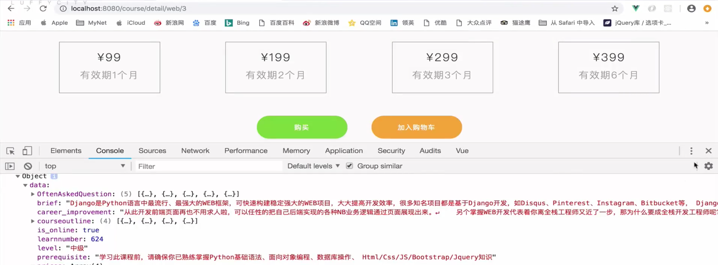 <!-- 课程详情 --> <div class="course-detail"> <div class="container"> <!-- v-html会将元素当成HTML标签解析后输出 --> <section class="course_item" v-html="content"></section> </div> </div> <div class="course-price"> <div class="container"> <span>可以根据不同的学习情况购买不一样的学习套餐哦!</span> <ul class="course-price-item" > <li v-for="(item, index) in coursedetail.prices" :key="item.id"> <p class="price">¥{{item.price}}</p> <p class="time">有效期{{item.valid_period_name}}</p> </li> </ul> <div class="course-action"> <button class="left">购买</button> <button class="right">加入购物车</button> </div> </div> </div>