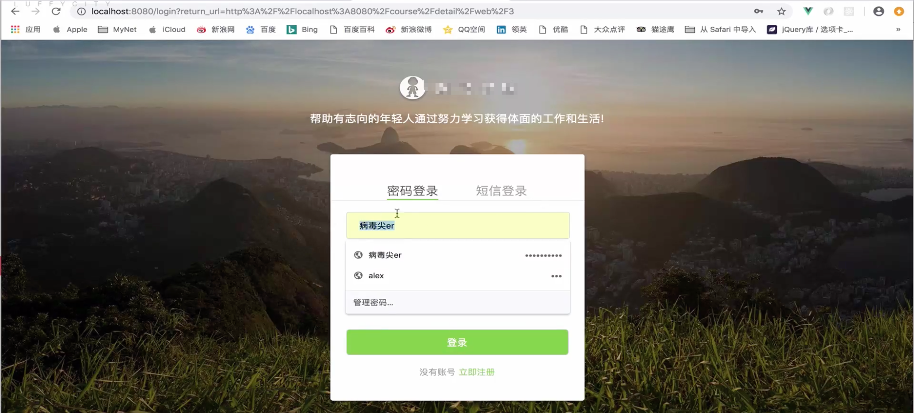 <template> <div class="box"> <img src="https://www.luffycity.com/static/img/Loginbg.3377d0c.jpg" alt=""> <div class="login"> <div class="login-title"> <img src="https://www.luffycity.com/static/img/Logotitle.1ba5466.png" alt=""> <p>帮助有志向的年轻人通过努力学习获得体面的工作和生活!</p> </div> <div class="login_box"> <div class="title"> <span>密码登录</span> <span>短信登录</span> </div> <div class="inp"> <input v-model = 'username' type="text" placeholder="用户名 / 手机号码" class="user"> <input v-model = 'password' type="password" name="" class="pwd" placeholder="密码"> <div id="geetest"></div> <div class="rember"> <p> <input type="checkbox" class="no" name="a"></input> <span>记住密码</span> </p> <p>忘记密码</p> </div> <button class="login_btn">登录</button> <p class="go_login" >没有账号 <span>立即注册</span></p> </div> </div> </div> </div> </template> <script> export default { name: 'Login', data(){ return { username: "", password: "" } } }; </script>