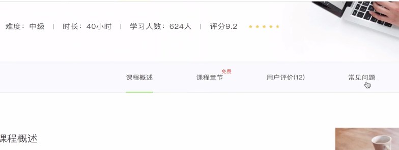 <div class="web-course-banner"> <div class="container"> <div class="title"> <img src="../../../static/images/play.png" height="67" width="67" alt=""> <h1 class="course-title">{{coursedetailtop.name}}</h1> </div> <span class="course-text">{{coursedetailtop.course_solgan}}</span> <div class="course-list"> <ul> <li class="detail-item"> 难度:{{coursedetailtop.level}} </li> <li class="sep"></li> <li class = detail-item>课程总时长:{{coursedetailtop.numbers}}课时/{{coursedetailtop.hours}}小时</li> <li class="sep"></li> <li class = detail-item>学习人数:{{coursedetailtop.learn_number}}人</li> </ul> </div> </div> </div> <div class="course-review"> <ul class="review-head-wrap"> <li class="head-item">课程概述</li> <li class="head-item">课程章节</li> <li class="head-item">用户评价({{coursedetailtop.review_number}})</li> <li class="head-item">常见问题</li> </ul> </div>