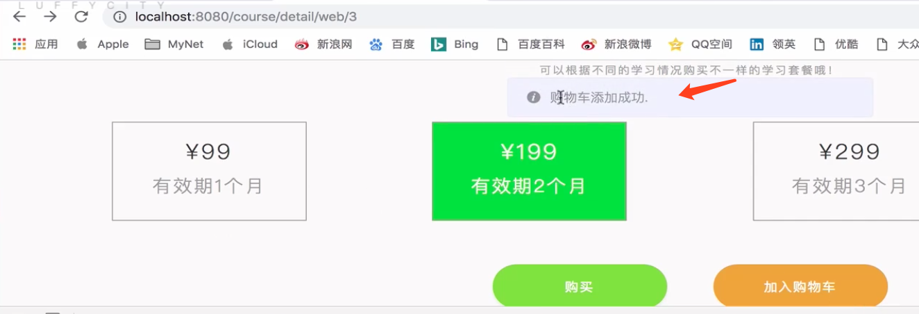 如果购物车已经有了当前课程,选择一个套餐后点击添加,信息为error_no:10,显示“购物车中该课程已更新成功”。