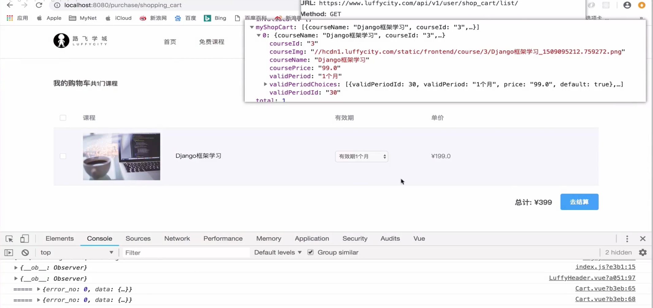 methods: { // 加入购物车事件 addShopCart(){ if(this.prices[this.currentIndex]){ // 不能直接使用this.currentIndex,因为第一个值为0 if(window.localStorage.getItem('access_token')){ // 判断用户是否登录 // 添加到购物车 alert('买吧'); let course = { courseId: this.$route.params.detailId, // 课程id validPeriodId: this.prices[this.currentIndex].valid_period, }; console.log(course); this.$http.shopCart(course) .then(res=>{ console.log("当前添加是否成功", res); if(res.error_no===0){ this.$message('购物车' + res.data.status); // elementui提示框 } if(res.error_no===10){ this.$message(res.msg); } }) .catch(err=>{ console.log('添加失败', err); }) } else { // 跳转登录页面 // 使用编程式导航来跳转 this.$router.push({ name: 'Login', query: { // window.location 只读属性,返回一个 Location 对象,其中包含有关文档当前位置的信息 return_url: window.location.href, // 将当前页面地址作为查询参数 } }) } } else { // element组件错误提示 this.$message({ message: '您还没有选择要加入的套餐哦!', center: true // 使用 center 属性让文字水平居中 }); } },
