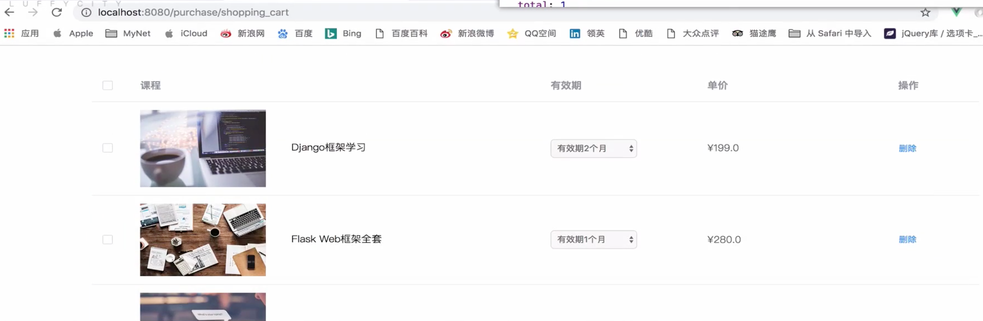 <div class="row"> <el-table ref="multipleTable" :data="shopCartList" tooltip-effect="dark" style="width: 100%" @selection-change="handleSelectionChange"> <el-table-column type="selection" width="55"> </el-table-column> <el-table-column label="课程" width="555"> <template slot-scope="scope"> <img :src="scope.row.courseImg" alt=""> <a href="javascript:void(0);">{{scope.row.courseName}}</a> </template> </el-table-column> <el-table-column prop="name" label="有效期" width="212"> <template slot-scope="scope"> <select> <option v-for="(item, index) in scope.row.validPeriodChoices" :value="item.validPeriodId" :key="index"> 有效期: {{item.validPeriodId}} </option> </select> </template> </el-table-column> <el-table-column prop="address" label="单价" show-overflow-tooltip> <template slot-scope="scope"> ¥{{scope.row.coursePrice}} </template> </el-table-column> </el-table> </div>