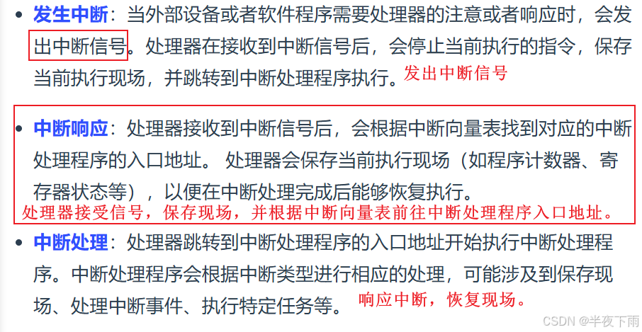 具体流程:保存现场-根据中断向量表处理终端-恢复现场。
