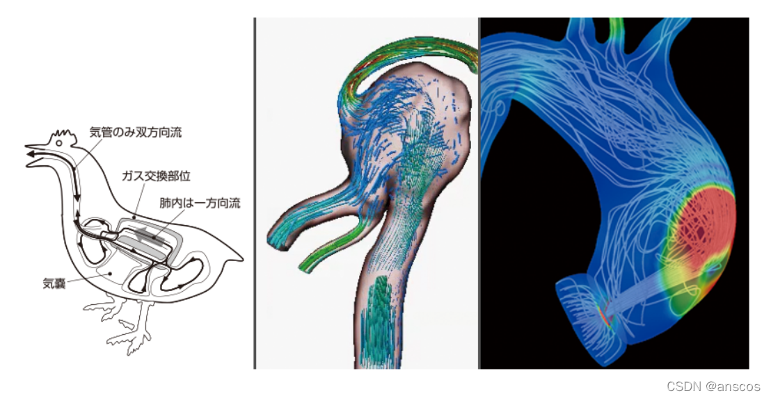 鸟体内的空气流是环状的,但只有一个入口。进入回路时,空气仅沿一个方向行进,而没有相反的方向流动。由于这个原因,已经认为在环的前面的突起起作用,但是没有真正验证过。因此,Nakamura等人通过对整个鸟类呼吸器官的CT扫描创建了一个分析模型,并模拟了气流。结果发现,突起实际上形成了单向流动。可以确认,这些突起使流路的截面积变窄,速度加快,并且笔直地前进而没有流到顶部(图5)。可以说,这是第一次通过仿真实现可视化来确认该机制。