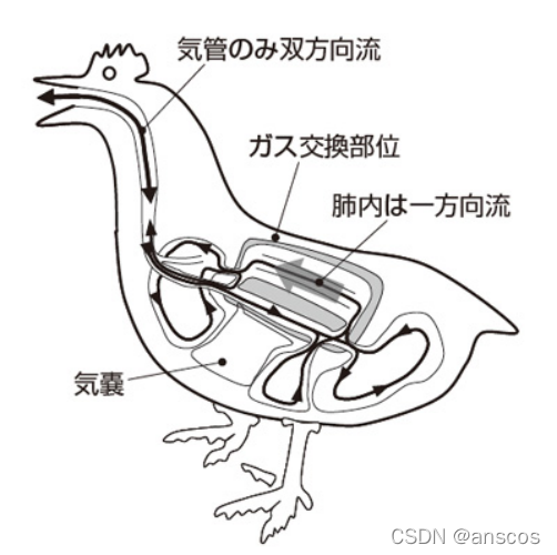 鸟类的“飞行”行为非常繁重,以至于需要大量的氧气。因此,鸟类的呼吸器官的结构与人类的器官完全不同。人体呼吸器官是一种往复式器官,它将空气从支气管送到肺部,然后再将其从体内排出。但是,对于鸟类,空气在肺内沿一个方向传播,因此可以连续交换气体(图4)。