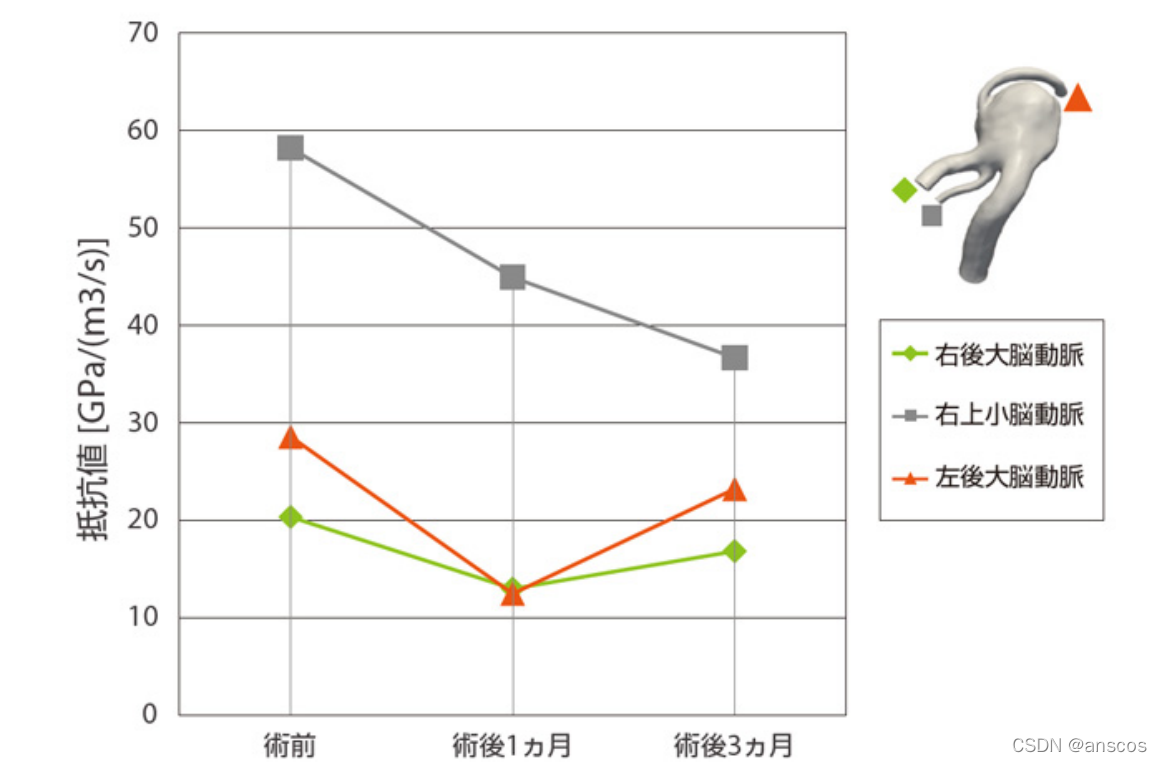 但是,在通过仿真来预测手术后的流量方面存在问题。传统上,在假定手术前后外周血管的阻力值相同的前提下进行术后血流预测。然而,血管也具有自动调节机制,并且手术后血管阻力可能会改变。因此,我们比较了使用MRI可以测量血流速度的患者手术前和手术后的血流速度。该图如图3所示。发现流速在手术前以及手术后1个月和3个月时发生了变化。脑血管是非常细的血管,存在很多地方难以进行流速检查等难题,但他希望在将来与CFD相结合的同时增加病例数并实现提前预测。