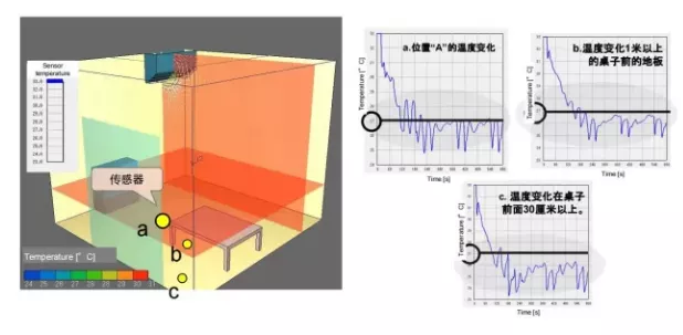 在Cradle中,使用空调的制热模式,传感器安装在图A所示的位置,空调被控制,只有当“A”的温度为27°C或更高时,空调才会吹出热气。