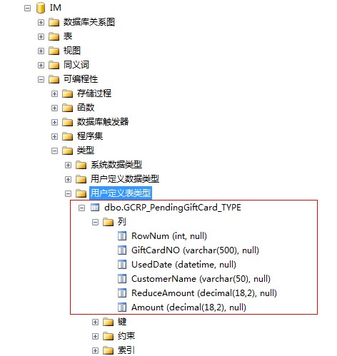 以下代码实现了在IM数据库中新建一个名称为GCRP_PendingGiftCard_TYPE的用户自定义表结构: