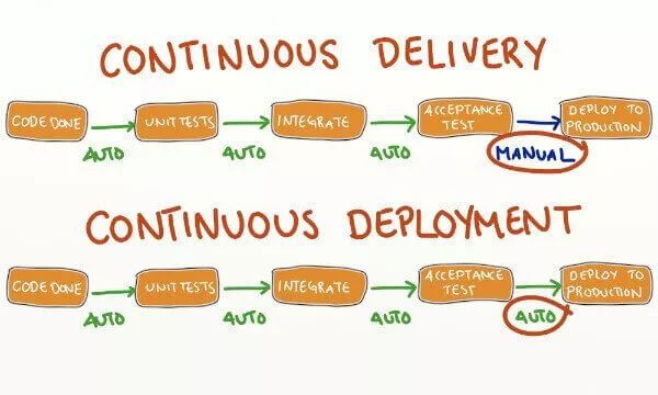 持续部署的前提是能自动化完成测试、构建、部署等步骤。它与持续交付的区别,可以参考下图。