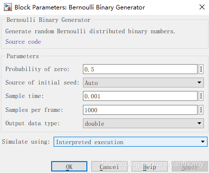 各模块参数设置为:依次为贝努利发生器,QPSK基带调制器、AWGN信道