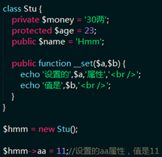 __set() :当为无权操作的属性赋值时,或不存在的属性赋值时,__set()自动调用,且自动传2个参数 属性 属性值